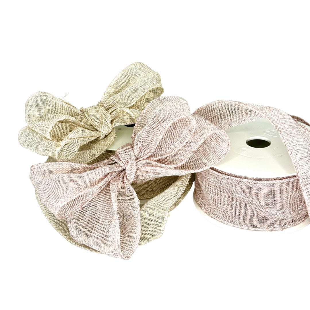 Upean keveän ja rennon oloinen, helposti muotoiltava nauha. Saatavana kahta väriä: luonnon pellava ja vaalea rosa. Nauha on noin 5 cm leveää. Valitse haluamasi metrimäärä.