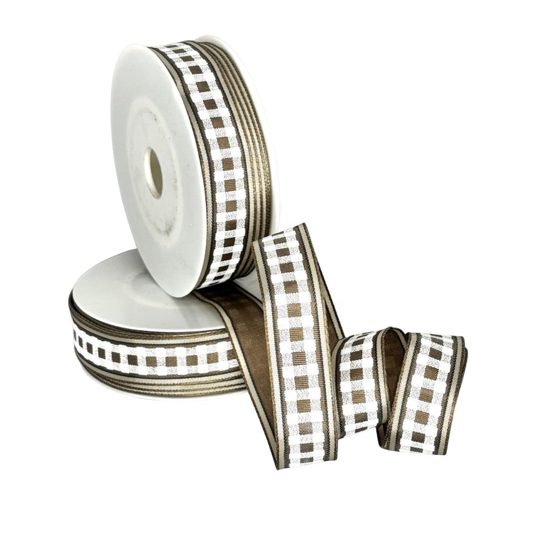 Ruskeansävyinen valkoruutuinen nauha, jossa kauniisti kiiltävät reunat ja napakat rautalankavahvikkeet reunoissa. Kihartuu kauniisti rusettiin tai asetelmaan.