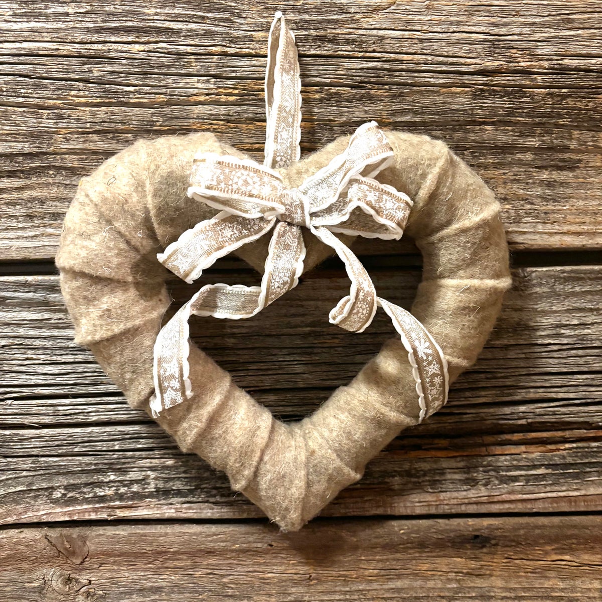 Huopapäällysteinen pieni sydänkranssi, jossa pitsireunainen pellavanauharusetti. Sopii ulos suojaisaan paikkaan tai sisälle.