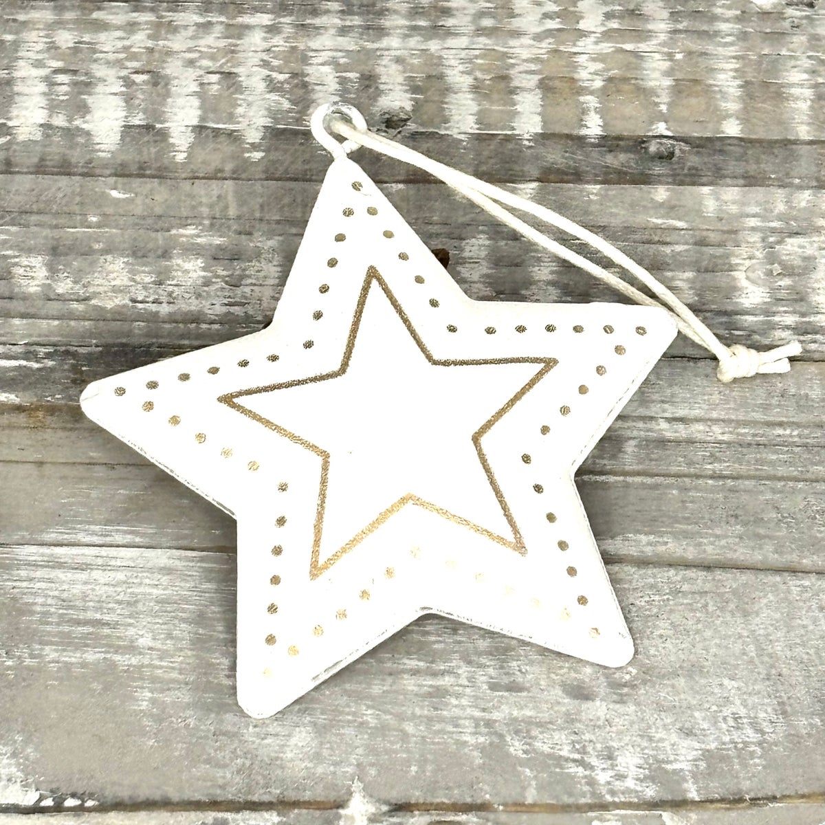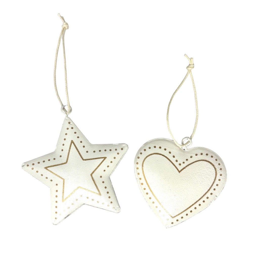 Sydän ja tähti, valkoisella pohjalla kultaiset koristeet. Laadukkaat ja kauniit koristeet vaikka kranssikoristeeksi. Valitse kumman haluat.