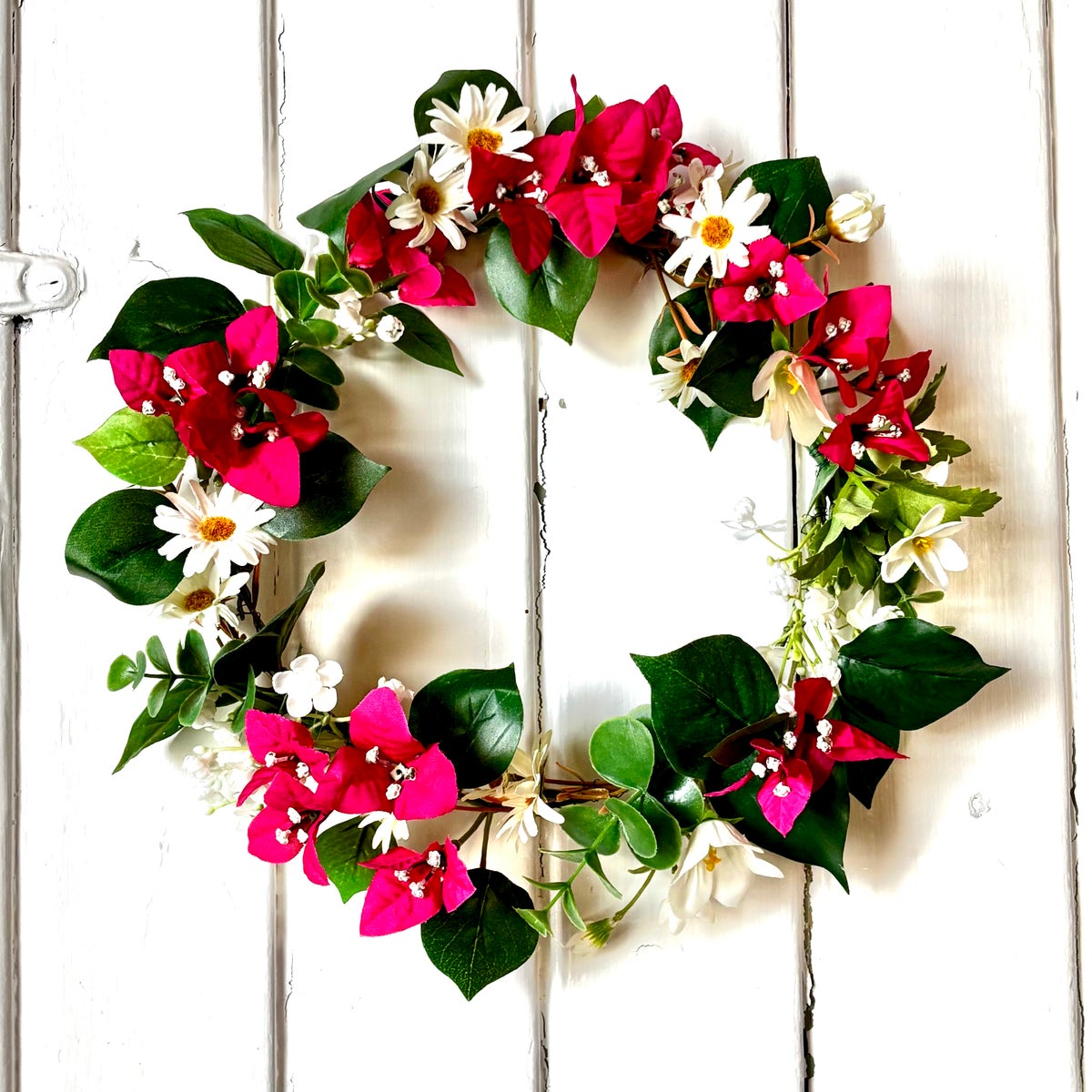 Kranssipajallamme käsityönä valmistettu kukkakranssi, jossa fuksianpunaista ihmeköynnöstä ja valkoisen sävyjä.